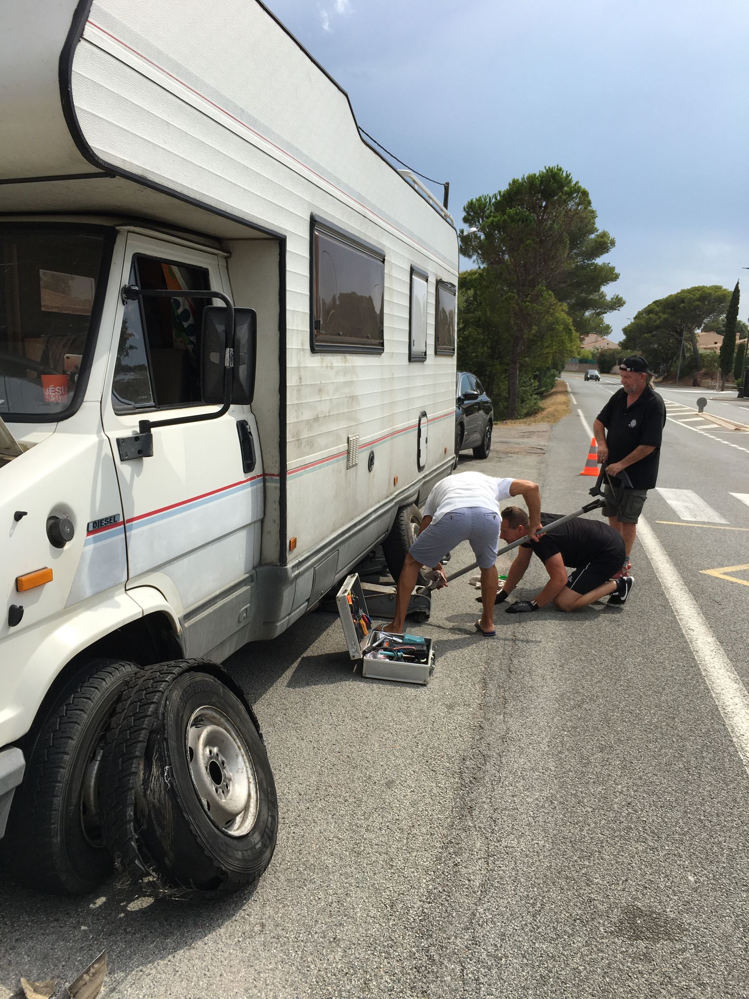 Puis, preuve ultime de notre chance dans notre malheur, un voisin, garagiste professionnel pour poids lourds, a pitié de nous et propose d’aller chercher son matériel afin d’économiser sueur et labeur. Quelques dizaines de minutes plus tard, le pneu est changé et le camping-car prêt à reprendre la route.